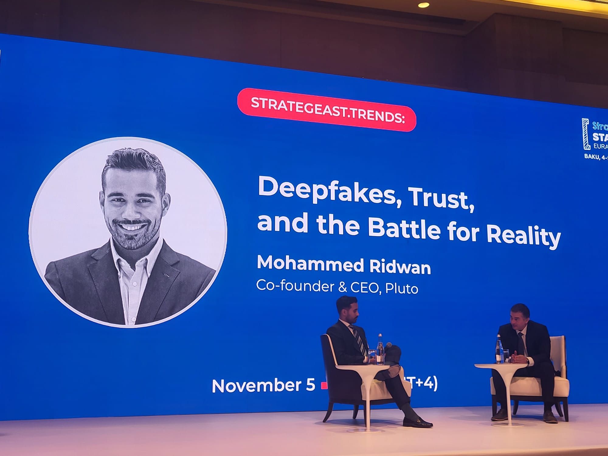 At the StrategEast State and IT Eurasian Forum, Mohammed Ridwan, co-founder and CEO of Pluto, led a powerful session titled “Deepfakes, Trust, and the Battle for Reality,” diving deep into one of today’s most urgent challenges — the erosion of truth and digital integrity in the age of synthetic media.