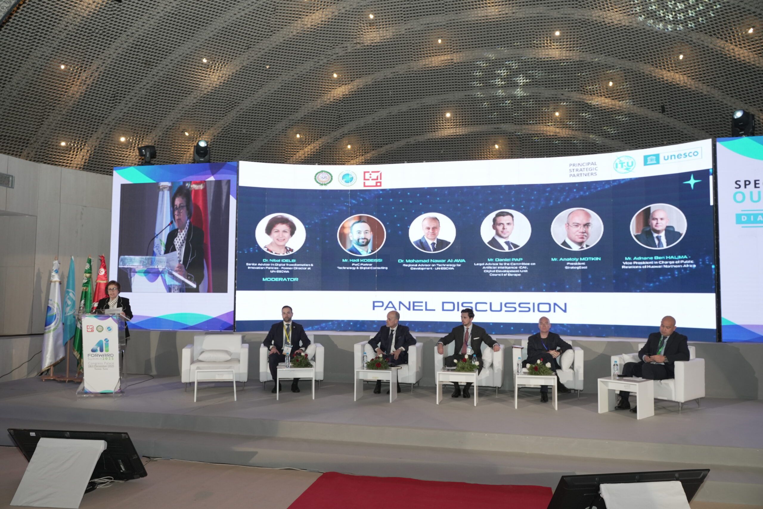 On December 3, Motkin spoke at the Policy Roundtable “AI Governance: Interoperability Towards Regional and Global Vision,” joining an expert panel that included Dr. Nibal Idelbi, Senior Advisor on Digital Transformation and Innovation Policies and former Director at UN-ESCWA; Hadi Kobeissi, Partner for Technology & Digital Consulting at PwC; Dr. Mohamad Nawar Al-Awa, Regional Advisor on Technology for Development at UN-ESCWA; Daniel Pap, Legal Advisor to the Council of Europe’s Committee on Artificial Intelligence (CAI); and Adnane Ben Halima, Vice President for Public Relations at Huawei Northern Africa.